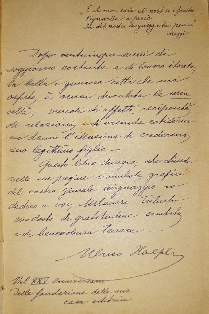 Così scriveva un grande cittadino milanese d’adozione, Ulrico Hoepli, nel 25° anniversario del suo arrivo a Milano dalla lontana Turingia e che fu riferimento di cultura e insegnamento dell’operosità meneghina: “Dopo venticinque anni di soggiorno costante e di lavoro iterato, la bella e generosa città che mi ospita è ormai diventata la mia città; vincoli di affetto, reciprocità di relazioni e di vicende cotidiane mi danno l’illusione di credermi suo legittimo figlio “.