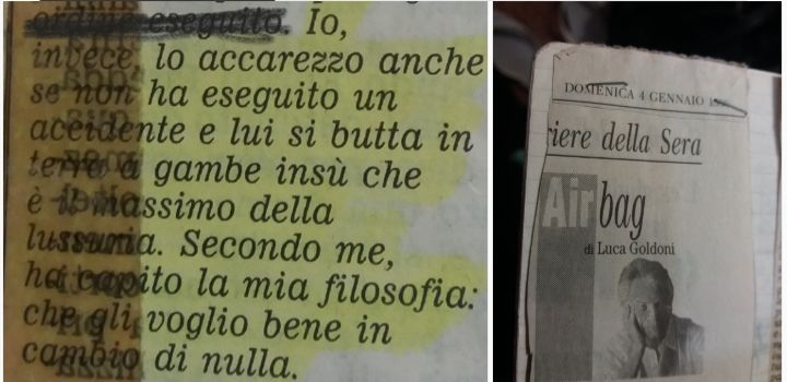 Io mi vanto di essere una dura, diciamo così, e mi commuovo difficilmente. Eccezion fatta per la perdita dei cani che ho avuto come compagni di vita. Per questo qui di seguito farò una cosa bizzarra, ma che m’ impedirà di sbrodolarmi in ricordi e racconti e quant’altro mi dilanierebbe a mettere nero su bianco. Che cosa farò? Metterò foto, trascrizioni di brani del mio diario (ebbene sì, confesso, ho un “diario” da più di 25 anni), post di Facebook, ritagli di giornale. Non trovo altro modo per “non parlare di cani”.