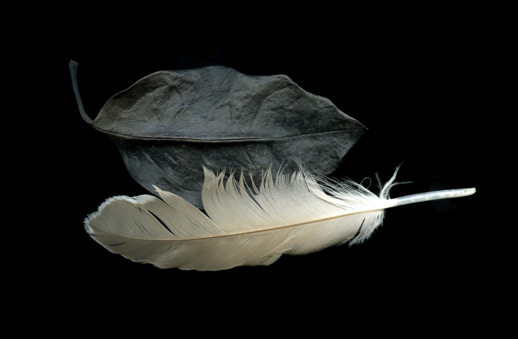 E la foglia nera fotografata da Bellesia accanto alla piuma bianca(senz’altro più pesante, anche metaforicamente) potrebbe rappresentare la fine di un successo, o l’idea di un successo neppure mai conquistato. Perché il destino, assieme al vento, l’hanno fatto volare via …