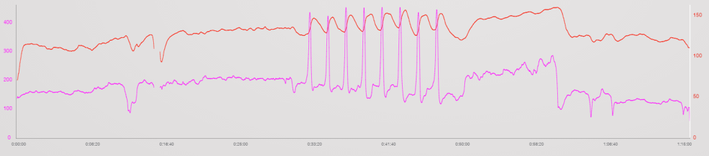 Nell’utilizzo pratico ricorda che il cuore durante uno sforzo ha un periodo di latenza e adattamento nel rispondere. Significa che è molto affidabile per sforzi continui di media e lunga durata, ma non è utilizzabile per sforzi di brevissima durata effettuati con riposo da fermo. Per esempio, posso indicare ad un atleta di fare 10 km a 150 bpm, ma non potrei mai dire di correre per 100m dopo aver riposato seguendo un target di frequenza cardiaca. Partendo da una situazione di riposo, difatti, la frequenza cardiaca salirà in modo progressivo senza raggiungere valori elevati a fronte di uno sforzo anche massimale se la durata è breve. Anzi, molto spesso il picco di frequenza cardiaca si raggiunge nei primi secondi della fase di recupero. Nel grafico puoi vedere il comportamento della frequenza cardiaca durante le diverse fasi di un allenamento. Durante gli sprint brevi aumenta con un certo ritardo rispetto allo sforzo e quindi non è utilizzabile come parametro. Nella seconda parte, invece, è maggiormente correlata allo sforzo e quindi affidabile per la misura dell’intensità sostenuta.