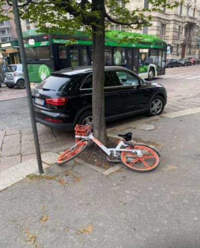 Ancora, prima di arrivare alla meta abbiamo dovuto cedere il passo a un monopattino e a una motocicletta, oltre a evitare delle biciclette cadute e abbandonate sul marciapiede.