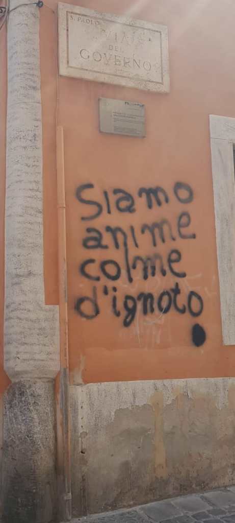 “Siamo anime colme d’ignoto”. Parole scritte in bella grafia sul muro di una casa nella mia città. E’ lì da anni. Nessuno cancella quel pensiero poetico perché piace, non imbratta il muro, ma arricchisce il muro, la città e chi passando legge e scatta una foto come ho fatto io. E pensa…