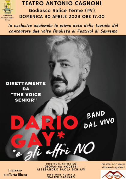 Aprile si è concluso con Dario Gay, di recente tornato alla ribalta grazie a ”The Voice Senior” su Rai 1, volto noto per aver partecipato a due Festival di Sanremo negli anni ’90 e per aver collaborato con Renato Zero, Enrico Ruggeri e Rita Pavone. Il cantante, con la sua band ha inaugurato la prima data del tour ”Dario Gay… e gli altri no!”, riservando la prima al Teatro di Godiasco.