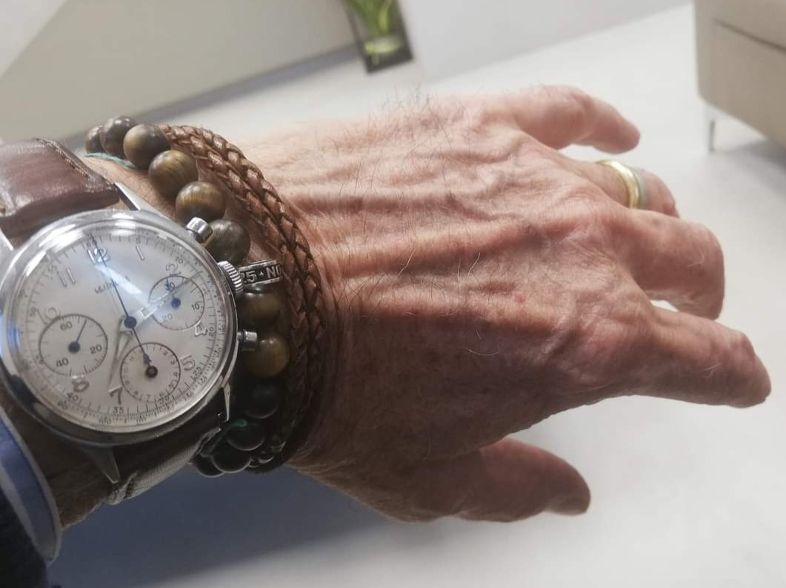 Con un titolo che sottolinea la sua consueta autoironia, il nostro Francesco Bellesia ha qui fotografato il proprio polso che sfoggia un elegante cronografo a carica manuale. Uno “scrittore del tempo“ (questo il significato letterale del termine cronografo), comunque accompagnato da braccialetti vari- esattamente come vediamo portare a molti ragazzi- perché la generazione 0ver60 non ha età quando si tratta di scegliere il proprio stile