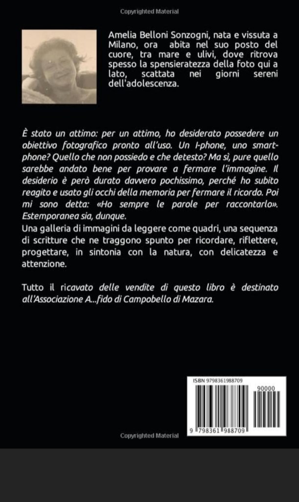 Ne approfitto per suggerirne la lettura. Si tratta di un librino lieve, ma a suo modo intenso, adatto all’estate che parrebbe in questi giorni arrivare. Si trova facilmente in rete; è disponibile anche per chi possiede un abbonamento ad Amazon Kindle Unlimited. Come tutto quello che scrivo, ha finalità benefica. L’ho legato all’Associazione A…Fido di Campobello di Mazara: un pugno di meravigliose e miracolose persone capaci di accudire, curare, ridare dignità e vita felice a tante povere anime quadrupedi, maltrattate o abbandonate. Di seguito la copertina e il suo retro.