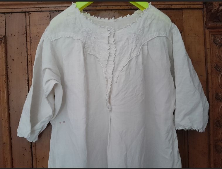 Dispiegò una stoffa bianca di un certo peso e al contempo leggera e fresca, un lino robusto; lo stese in lunghezza e apparve un ampio camicione bianco, lungo fino alle caviglie di una donna di media statura. Le maniche merlate arrivavano al gomito, lo stesso ricamo era ripreso sulla scollatura abbottonata; ai lati di asole e bottoncini erano ricamati bianco su bianco fiori ancora attaccati ai loro steli, piccoli trafori per una pudicissima trasparenza.