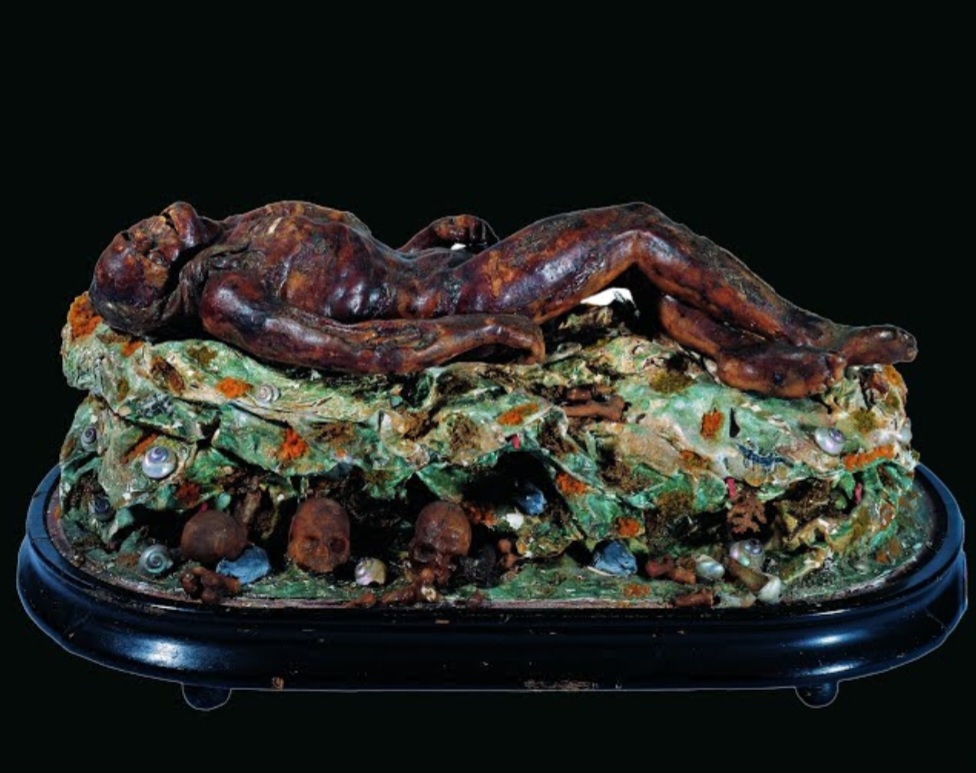 Qui la cera non è più soltanto materia d’ingegno, ma strumento didattico, vera e propria tecnologia della conoscenza. Pittori, scultori e anatomisti (come Giuseppe Ferrini, Clemente Susini, Antonio Matteucci) operano a braccetto per costruire una collezione anatomica di impressionante accuratezza. Queste cere sono qualcosa di radicalmente nuovo: riproduzioni fedelissime di dissezioni reali, ma anche oggetti di raffinata eleganza e bellezza quasi teatrale. Emblematica è la celebre Venere dei Medici di Susini: distesa con composta grazia su cuscini di seta, un filo di perle a incorniciarle il collo, lo sguardo assorto in una quiete irreale. Poi il gesto rivelatore: torace e addome si “scoperchiano”, rivelando con precisione stratigrafica muscoli e visceri, fino al feto raccolto nel grembo.